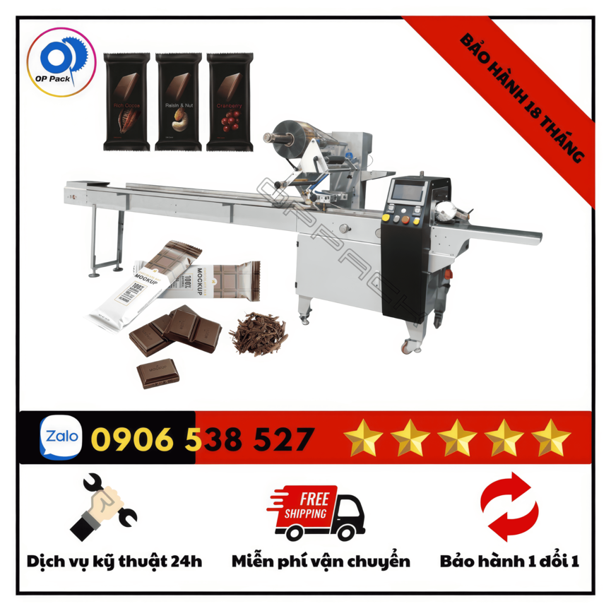 Máy đóng gói bánh socola OP Pack là thiết bị đóng gói tự động chuyên dụng cho các dòng bánh socola, bánh phủ socola và bánh kẹo ngọt. Máy được thiết kế tối ưu để xử lý sản phẩm nhạy cảm với nhiệt độ, đảm bảo quá trình đóng gói ổn định, không làm biến dạng bánh. Hệ thống đóng gói dạng nằm giúp bao bì ôm sát sản phẩm, đường hàn chắc chắn, kín khít, góp phần bảo quản bánh tốt hơn và giữ được tính thẩm mỹ.